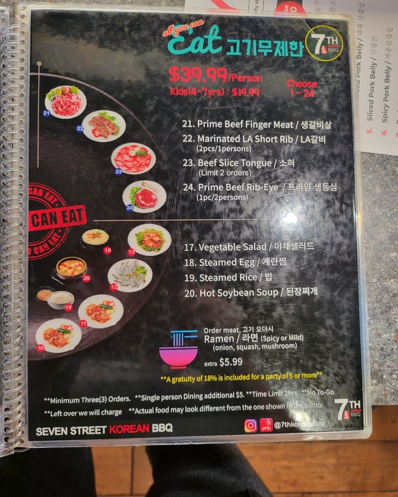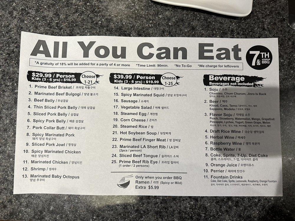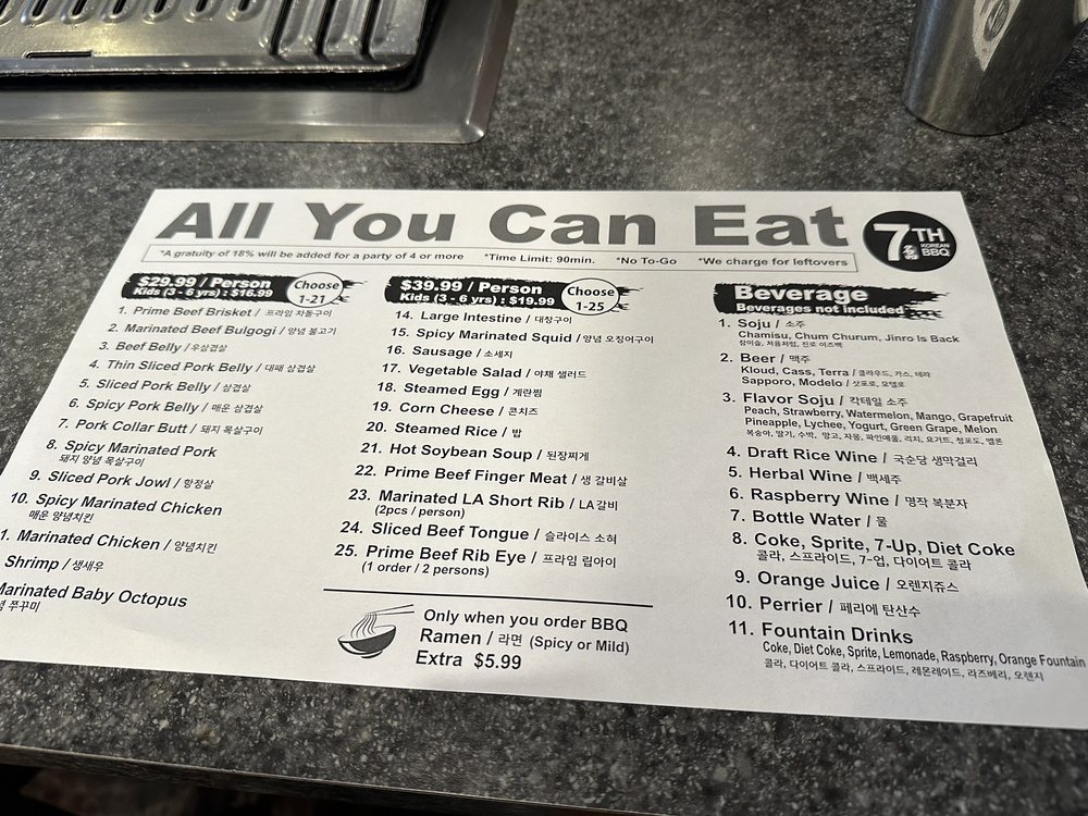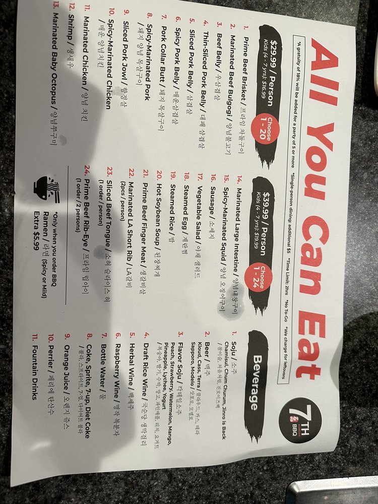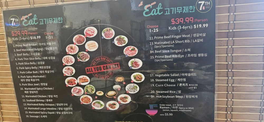7th Korean BBQ is a hidden gem in Ktown, offering top-notch quality meats and side dishes. Owned by a passionate Korean lady, the restaurant stands out for its consistency in meat quality and presentation. The menu includes premium cuts like brisket, beef belly, pork belly, pork jowl, and pork collar butt. Customers praise the attentive and friendly service, with staff going the extra mile to ensure a pleasant dining experience. The banchan, including homemade samjjang, adds a flavorful touch to the meal. With a variety of options for AYCE KBBQ, including a higher-priced selection with premium meats, 7th Korean BBQ surpasses expectations. The welcoming atmosphere, quality food, and excellent customer service make it a must-visit spot for Korean barbeque enthusiasts.